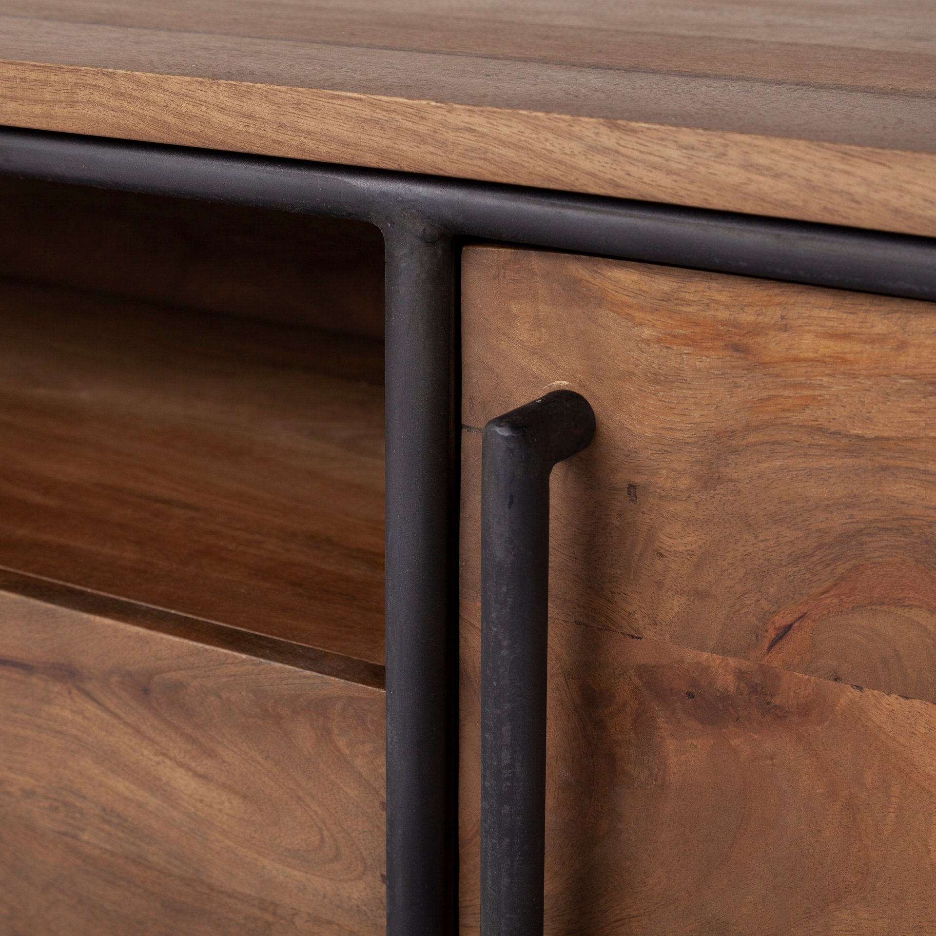 Meticulously crafted from solid Indian Mango wood and finished in a sophisticated medium-brown tone, the Maddox is an amazing media console that is guaranteed to be a functional and visually enticing addition to any dining room. Featuring two closed-door compartments fitted with removable shelves in addition to two drawers and an open storage box, the Maddox offers ample storage space for a wide variety of media accessories. This stylish media console is braced by a sleek, matte-black toned iron frame that not only guarantees stability and balance but also adds to its visuals. A perfect mix of style and functionality, this classy media console fits perfectly in spaces based on the Mercana Modern, Woodlands and Industrial design styles.