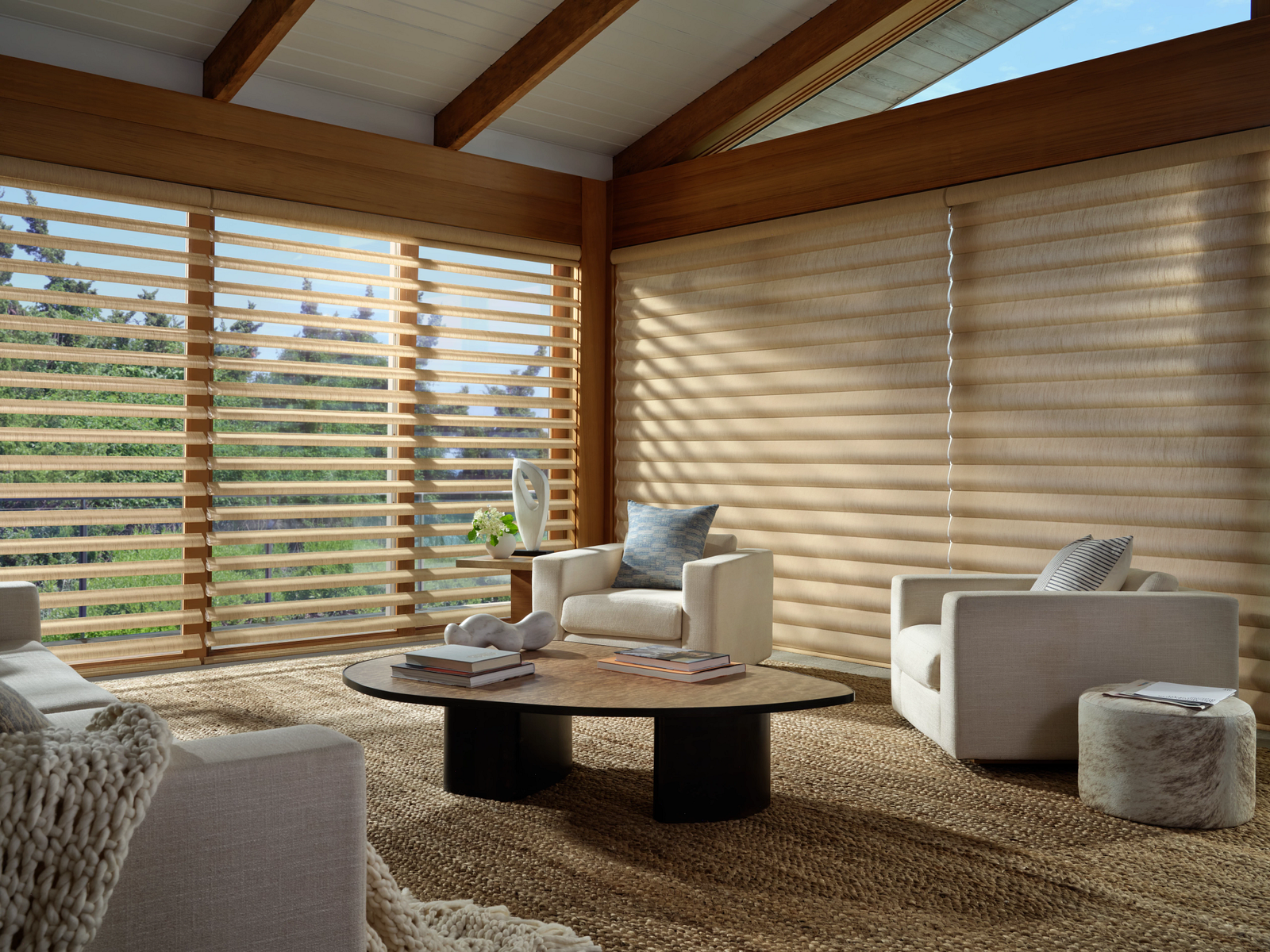 Sunscreen Roller Shades provide protection for your interior finishes and furnishings, reduce glare, and help keep the temperature of your home more comfortable during summer. They are available in different degrees of light filtration, cutting out between 90-99% of incoming light. During the day, you can still enjoy your views, and they can provide some daytime privacy. Choose from rooler style or vertical Skyline Panels.
