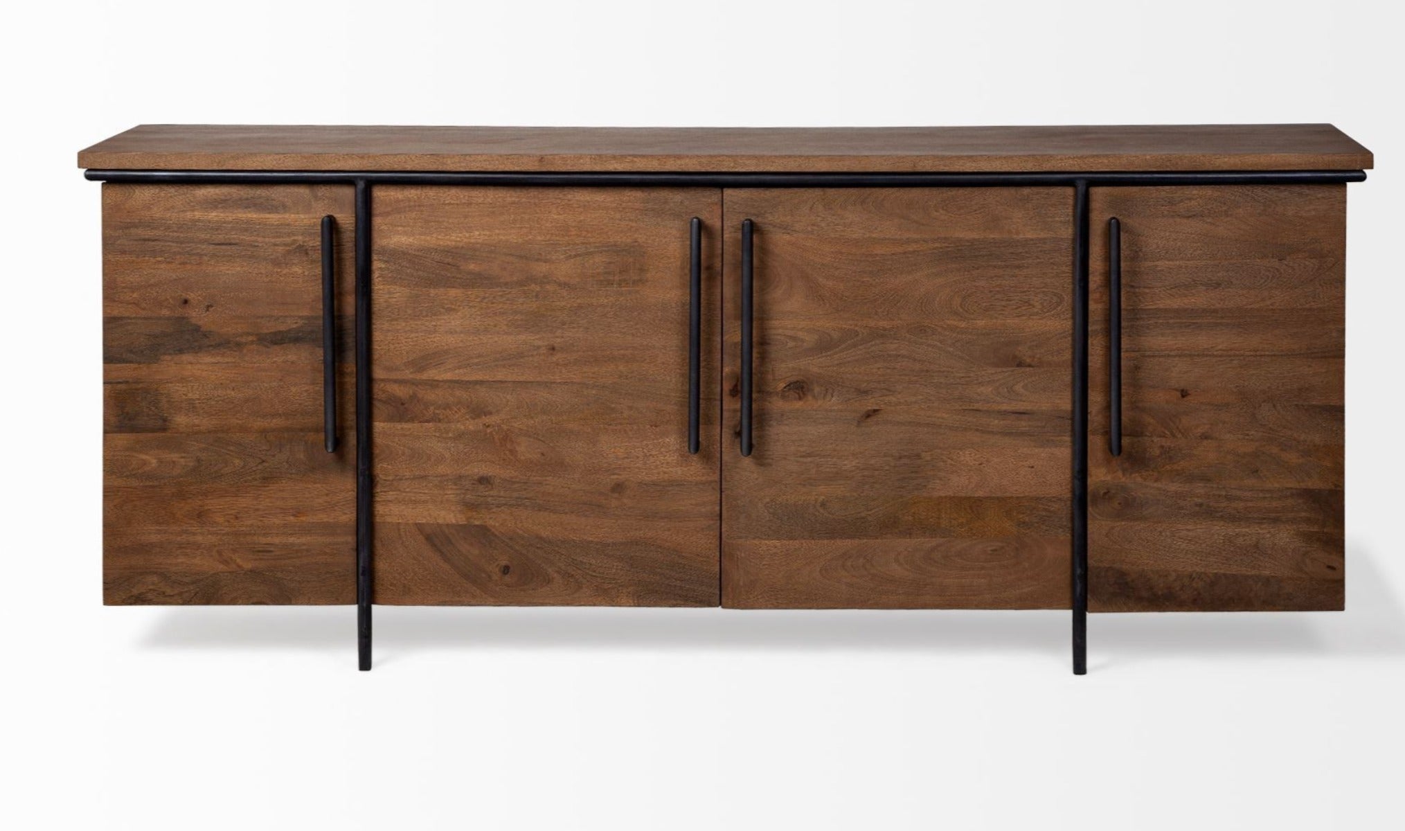 Meticulously crafted from solid Indian Mango wood and finished in a sophisticated medium-brown tone, the Maddox is an amazing sideboard that is guaranteed to be a functional and visually enticing addition to any dining room. Featuring four cabinets fitted with removable shelves, the Maddox offers ample storage space for a wide variety of items ranging from kitchenware and table linen to décor and accessories. This stylish, contemporary sideboard is braced by a sleek, matte-black toned iron frame that not only guarantees stability and balance but also adds to its visuals.