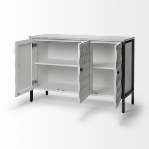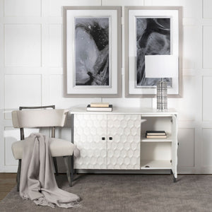 The Savannah is an elegant, engineered wooden cabinet finished in a rustic white polish with hexagonal, embossed details on the front, and a metal frame.